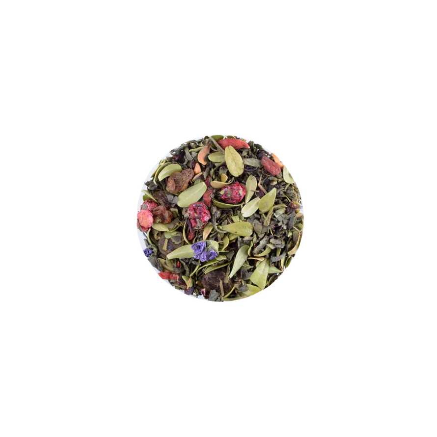 Богатый и яркий купаж на основе классического зелёного китайского чая, дополненного сублиматом красной смородины и ягодами годжи. Вкус — многослойный, с фруктовой кислинкой, лёгкой сладостью и насыщенным ягодным послевкусием.