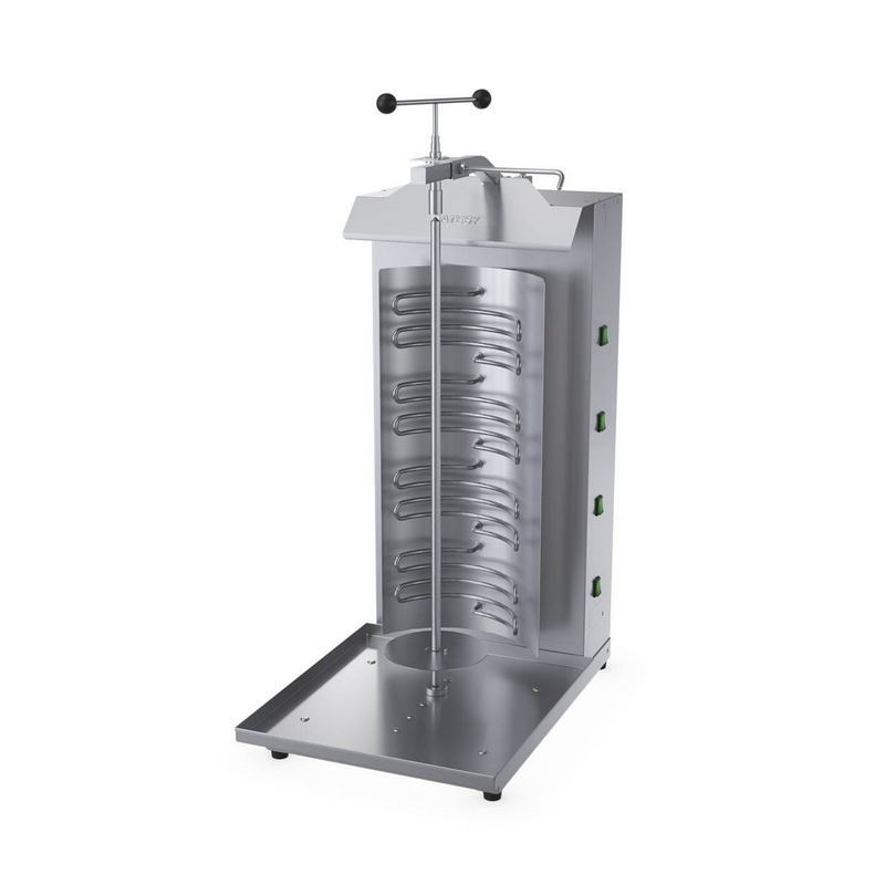 Гриль для шаурмы Атеси Шаурма-4-Эл-05-Н (с ручным приводом) – представитель серии оборудования для заведений быстрого питания: бистро и стрит-фудов для приготовления горячего восточного блюда – шаурмы. Принцип эксплуатации оборудования – насаживание мясного филе на вертикальную стойку и сформирование мясного цилиндра с последующей жаркой бесконтактным способом при помощи инфракрасного нагрева.