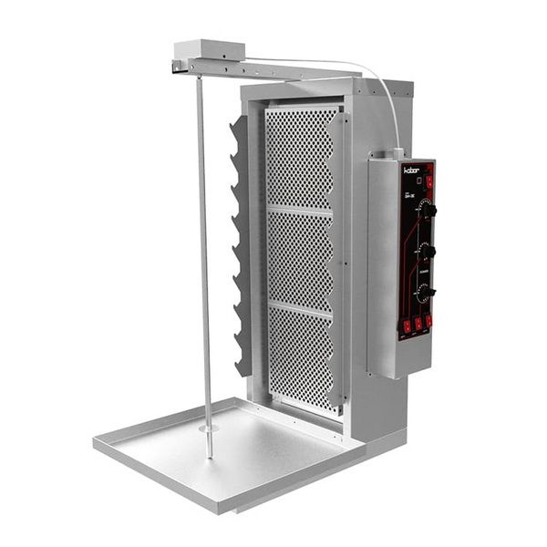 Гриль для шаурмы КОБОР GM-3E предназначен для профессионального приготовления популярного восточного блюда в условиях уличной торговли. Аппарат позволяет добиться максимально качественной прожарки мяса посредством вращения вблизи трёх нагревательных спиралей с плавной регулировкой нагрева. Принцип действия аппарата заключается в том, что филе из телятины, свинины или курицы, замаринованное по особому рецепту насаживается на специальный шампур и вращается при помощи электродвигателя около нагревательного элемента до его готовности.