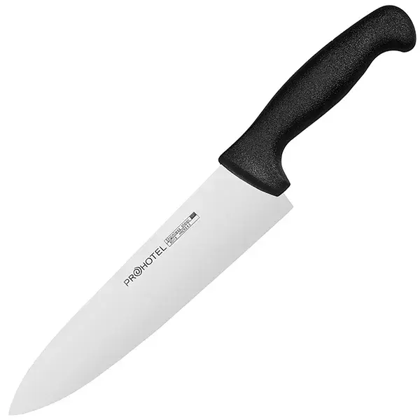 Поварской нож «Проотель» — профессиональный инструмент премиум-класса с увеличенными параметрами для выполнения самых сложных кулинарных задач. Благодаря массивной конструкции и широкому лезвию идеально подходит для работы с крупными продуктами в условиях интенсивной эксплуатации.