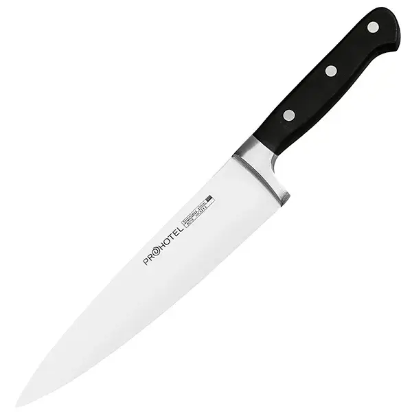 Поварской нож «Проотель» — профессиональный инструмент экстра-класса с максимальными параметрами для выполнения самых сложных кулинарных задач. Благодаря массивной конструкции и широкому лезвию идеально подходит для работы с крупными продуктами в условиях интенсивной эксплуатации.