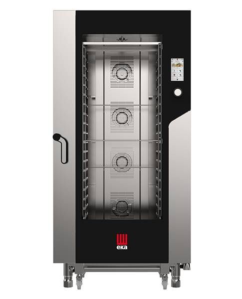 Прямоугольный корпус печи изготовлен из нержавеющей стали и стоит на регулируемых ножках. Рабочая камера обшита пищевой сталью и оборудована мощными ТЭНами, 5-ю реверсивными 5-тискоростными вентиляторами, инжекторами для увлажнения. Для размещения 20 гастроемкостей GN 1/1 используется вкатная тележка с направляющими.