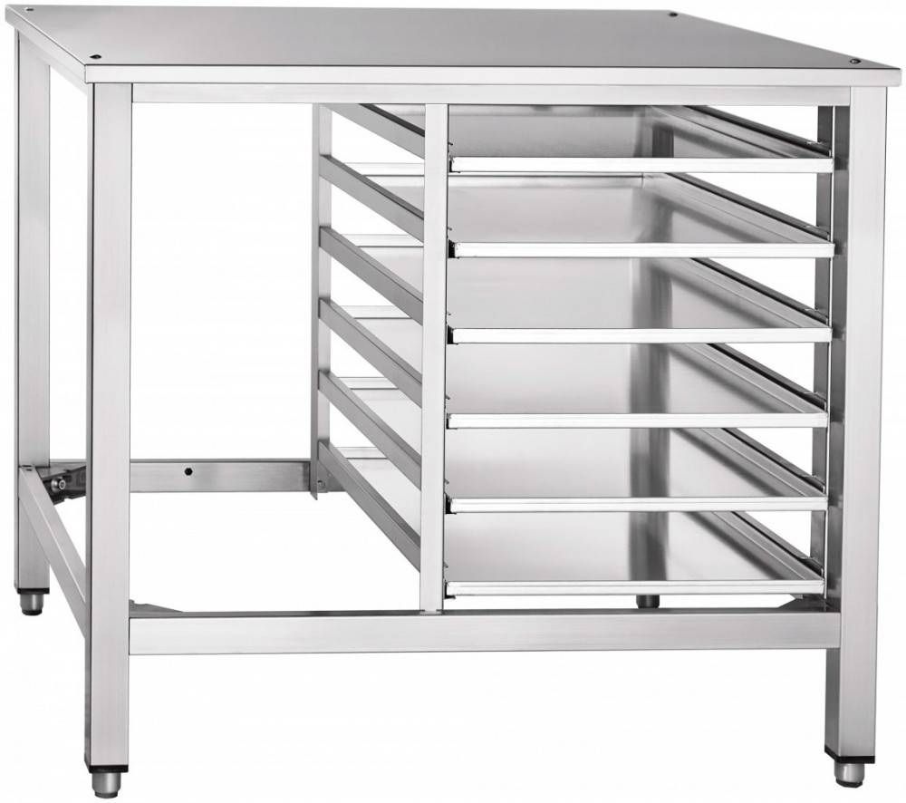 Подставка выполнена из нержавеющей стали марки AISI304. Металл отличается повышенной прочностью и устойчивостью к коррозии и деформации. В нижней части расположены направляющие для установки 6 гастроемкостей.