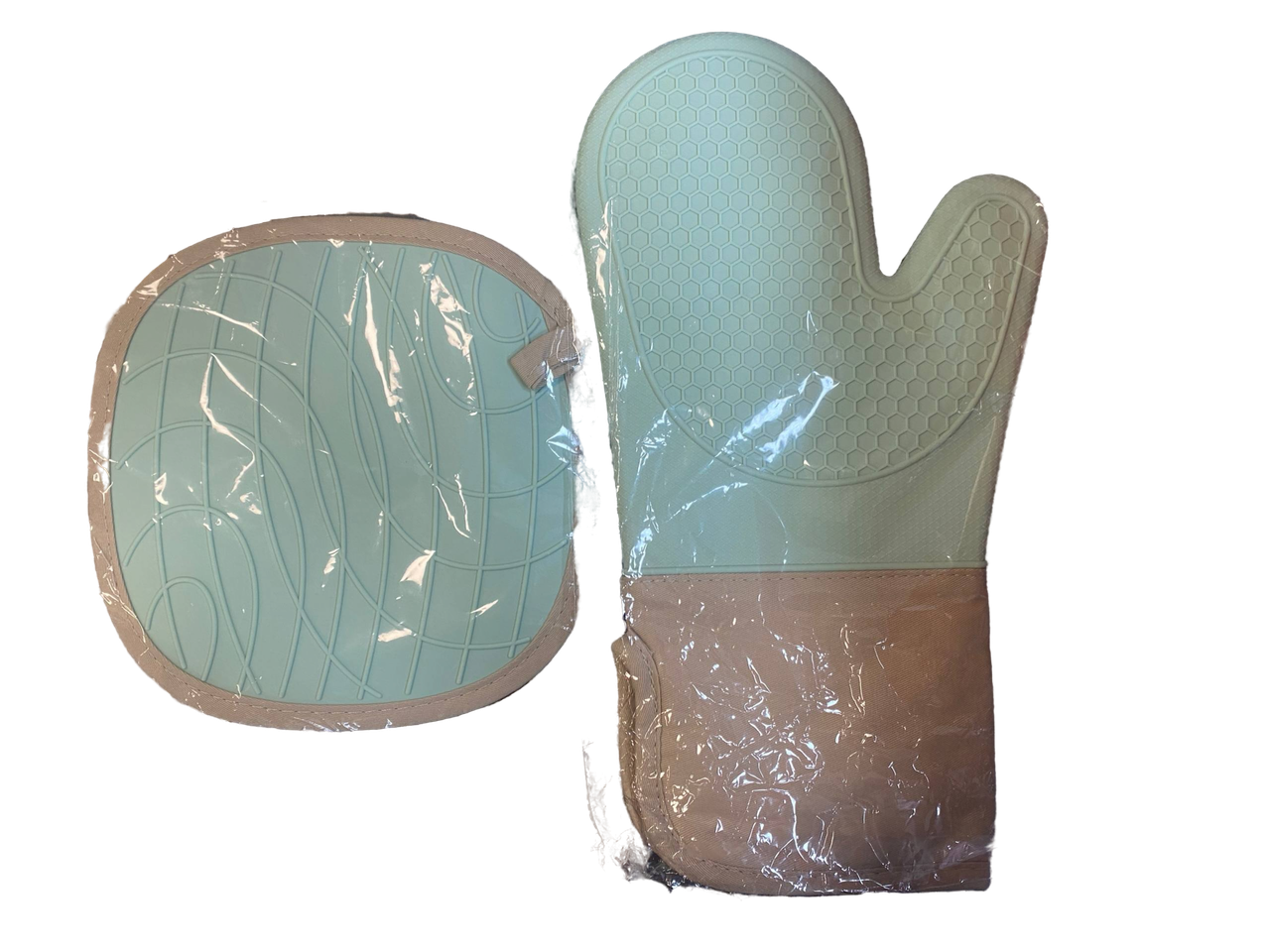 Силиконовая рукавица с коротким манжетом и прихватка — практичный дуэт для безопасной работы на кухне.