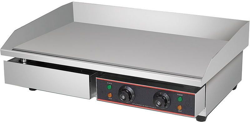 На гладкой жарочной поверхности предусмотрено две зоны нагрева с независимой системой регулировки температуры. На механической панели установлено два поворотных регулятора со световыми индикаторами включения и нагрева. На жарочной панели предусмотрен трехсторонний бортик для защиты от разбрызгивания.